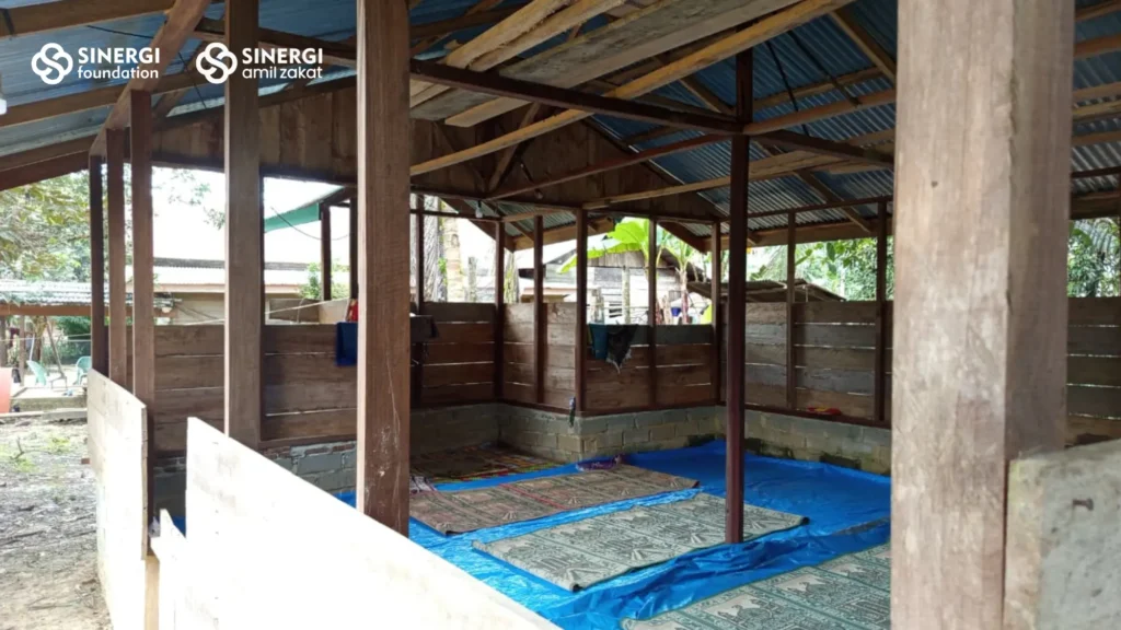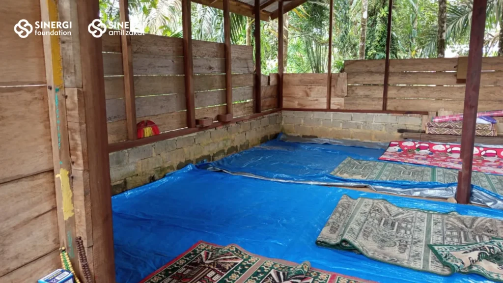 Mushola yang dibangun dari gotong royong warga setempat itu berukuran 6×7 meter, beralaskan terpal, dengan dinding dari kayu seadanya yang hanya mampu menutup sebagian mushola. Kondisi mushola saat ini sungguh memprihatinkan: